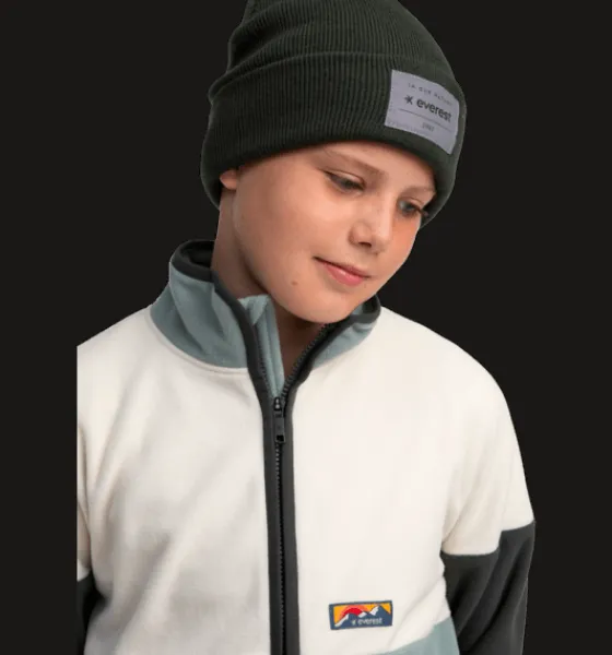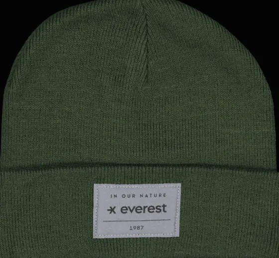 Stickad mössa i akryl. Ett uppvik nedtill gör den dubbelt så tjock över öronen för ökad värme. Den är dessutom försedd med ett reflekterande Everest-märke framtill.