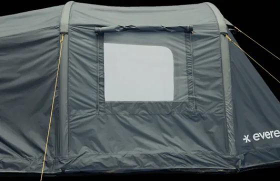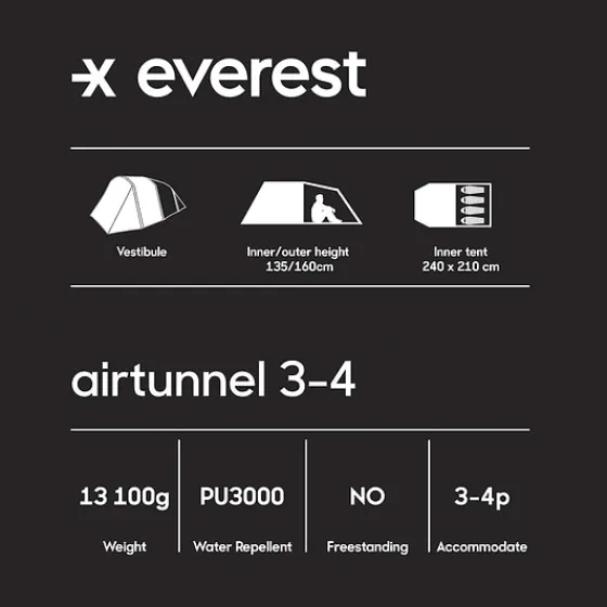 Everest Air Tunnel 3-4 är ett tunneltält för upp till fyra personer. Det är något mindre än Air Tunnel 5, men bjuder i gengäld på ett mera kompakt mått och betydligt lägre vikt. Tältet har ändå gott om utrymme att sitta i absiden. Det kan snabbt och enkelt sättas upp tack vare uppblåsbara tältbågar i tåligt TPU-material. Yttertältet är försett med två fönster med myggnät. Fönstren ger bra ljusinsläpp samtidigt som de ger bra ventilation. Yttertältet har även justerbar ventilation på kortsidan mot sovdelen. Golvet i PE-material är både tåligt och helt vattentätt. Golvet och väggarna är hopsydda vilket gör det lättare att hålla rent inuti tältet och gör det svårare för insekter att ta sig in.