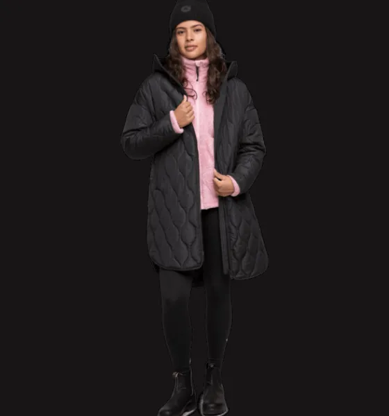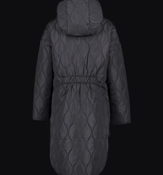 Dome Coat från Everest är en lättviktskappa med huva och ett dekorativt rynk bak i ryggen. Den har en lätt oversize-passform och en tunnare, lättare syntetvaddering som gör att kappan passar både som höstjacka och som vårjacka. Kappan är delvis tillverkad av återvunnet material och har en vattenavvisande ytbehandling som står emot lättare regn. Den har en tvåvägs dragkedja framtill med skyddande vindslå innanför för att hindra vind och kyla att komma in. Kappan är 3-i-1 kompatibel. Ett fäste bak i nacken gör att du kan koppla ihop din tunnare lättviktsjacka, som ett värmande lager, under en annan jacka. På så sätt kan du skapa kombinationer av plagg som du kan använda under en längre del av säsongen.