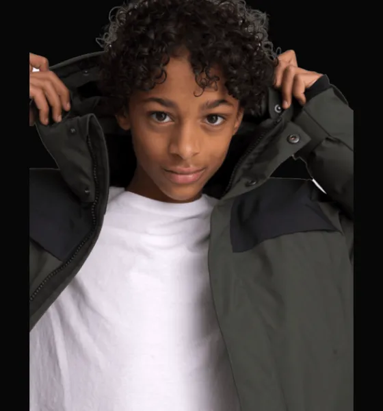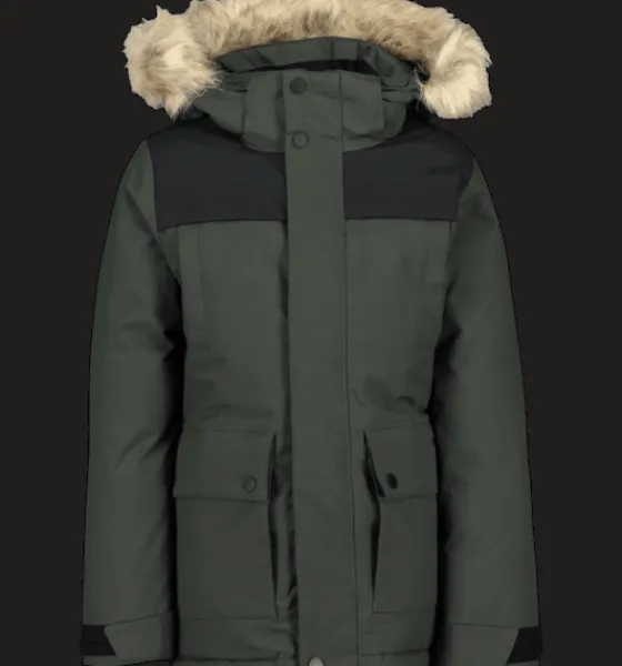 Varmfodrad, vind- och vattenavvisande juniorjacka med värmande, dunliknande vaddering av återvunnen polyester. Jackan har en avtagbar huva med löstagbar syntetpäls och dubbel vindslå vid dragkedjan för att hindra vind och kyla att tränga in. Den är justerbar i både midja och ärmslut för bästa passform, och har reflekterande detaljer vid rygg och ärmslut. Ärmarna har dessutom en invändig elastisk mudd för att skydda mot snö och kyla. Jackan är även försedd med stora, rymliga fickor med mjukt innerfoder, och med ett mjukt foder på insidan av kragen för en varmare, skönare känsla. Jackans ytbehandling är fri från miljöfarliga fluorkarboner och innerfodret är färgat med energibesparande Solution Dye-teknik.