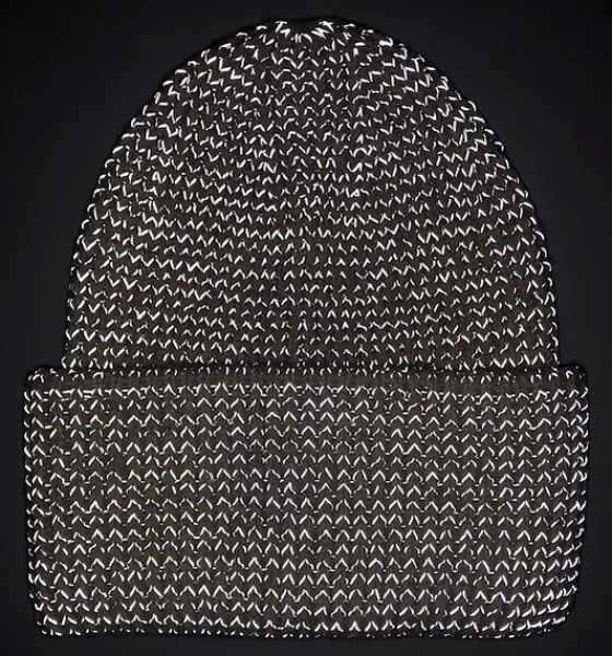Tjock, stickad mössa med instickad, reflekterande tråd och med uppvik som gör den dubbelt så tjock vid öronen för extra värme. Mössan är stickad med ribbstickning vilket gör den elastisk så att den passar många olika huvudstorlekar.