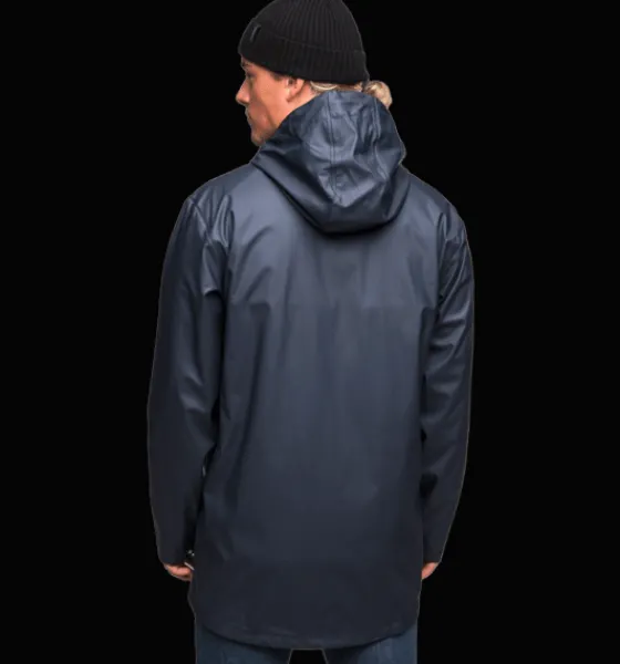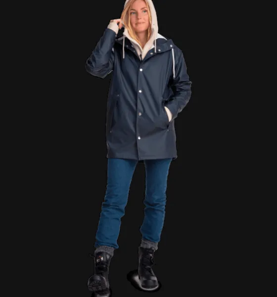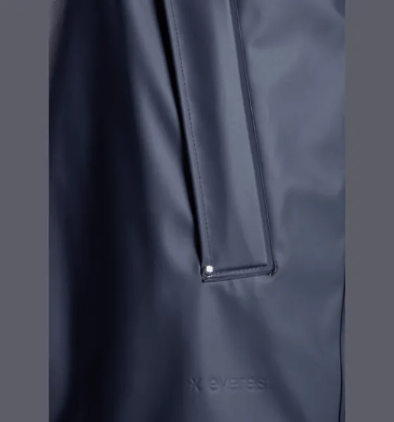 Regnjacka i PU-material. Den har vattentätt yttertyg, svetsade, vattentäta sömmar och mjukt innerfoder av återvunnet material. Jackan är också utrustad med två fickor samt med justerbar huva och justerbara ärmslut.