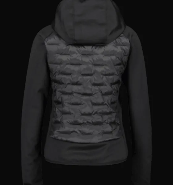 Lätt vadderad jacka med fram- och baksida i ett lätt och smidigt material som är vindtätt och vattenavvisande. Ärmar, huva, nederdel och sidopaneler är gjorda i ett mjukt, följsamt stretchmaterial som är borstat på insidan för värme och komfort. Jackans ytbehandling är fri från miljöfarliga fluorkarboner.