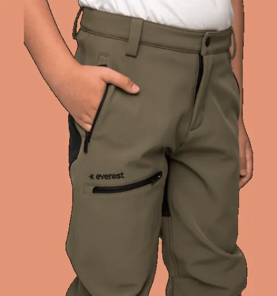 Funktionsbyxor i slitstarkt, stretchigt softshell-material med mjuk och värmande fleece på insidan. De passar bra att använda som friluftsbyxor/vandringsbyxor under kyliga höstdagar. Byxorna har knapphålsresår i midjan för justerbar passform och hällor för bälte. De är förstärkta med vattenavvisande material vid rumpan för att bättre tåla tuffa utomhusäventyr. Byxorna har också tre fickor med dragkedja och förböjda knän för bättre rörlighet. Bensluten går att justera med kardborre och har också en dragkedja i sidan för enklare på- och avtagning. Plagget är fritt från miljöfarliga fluorkarboner.