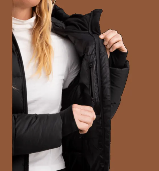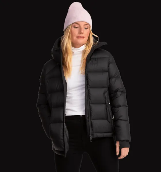 Dunjacka med värmande 90/10-dunfyllning, justerbar huva och dragkedja fram med skyddande vindslå innanför för att hindra vind och kyla att tränga igenom. Jacka har också elastisk innermudd med tumhål i ärmsluten, dragsko i nederkant och stora generösa ytterfickor med dragkedja och med mjuk borstad trikå på insidan för en varmare känsla. Plagget är fritt från miljöfarliga fluorkarboner.