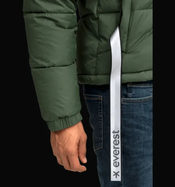Jacka med puffig, värmande vaddering av återvunnet material. Passar bra att använda både som en höstjacka och som en vinterjacka. Jackans yttertyg är av ripstop-material i nylon, vilket gör den extra slitstark. Den har två ytterfickor med dragkedja och med mjukt innerfoder som ger en varm och skön känsla om du behöver värma händerna. Inuti fickorna finns dessutom ett fastsytt band med reflekterande tryck, smidigt att fälla ut vid behov. Jackan är 3-i-1 kompatibel. Ett fäste bak i nacken gör att du kan koppla ihop en tunnare lättviktsjacka med den här jackan. På så sätt kan du skapa kombinationer av plagg som du kan använda under en längre del av säsongen. Plaggets ytbehandling är fri från miljöfarliga fluorkarboner.